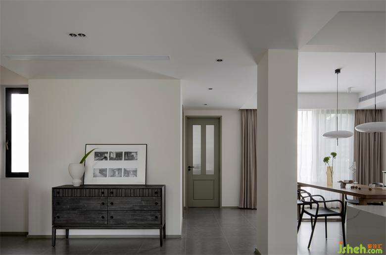 黑色斗柜+橄欖綠木門+原木色餐桌,看似不統(tǒng)一的色彩,營造出和諧的色彩氛圍。