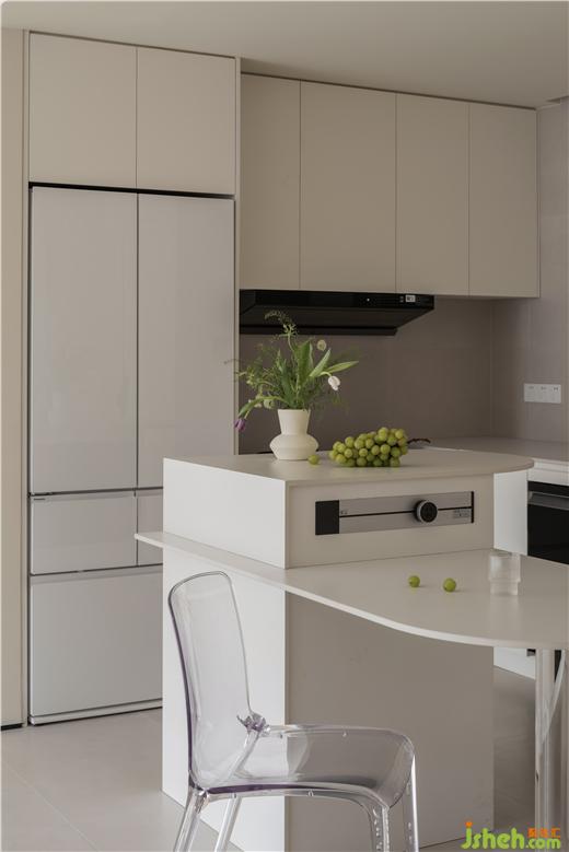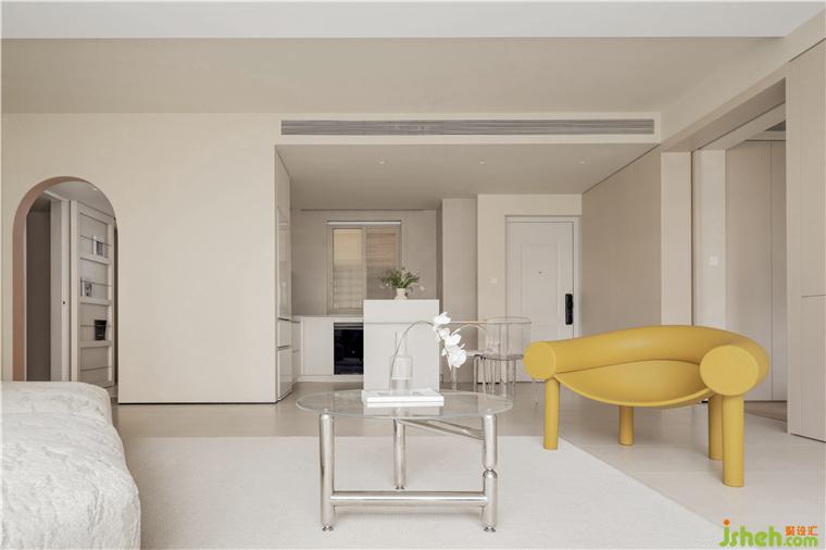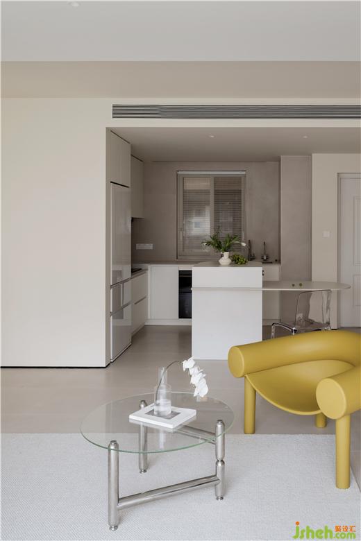 于是設計師將陽臺的部分墻體拆除,打開入戶的視線,獲取美觀的入戶體驗。同時,將主動線上移,擴大走廊尺寸,使全屋動線具有更好的舒適性。