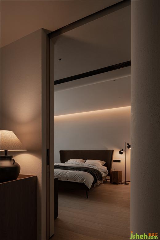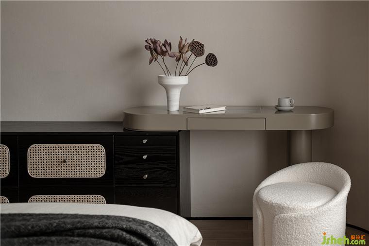 主臥延續(xù)整體空間設計的自然樸素質感。應對屋主的梳妝和儲物需求,在床尾特別設計了斗柜+梳妝臺的整體成品家具,成都香悅府裝修設計將空間的尺度把握得恰到好處。