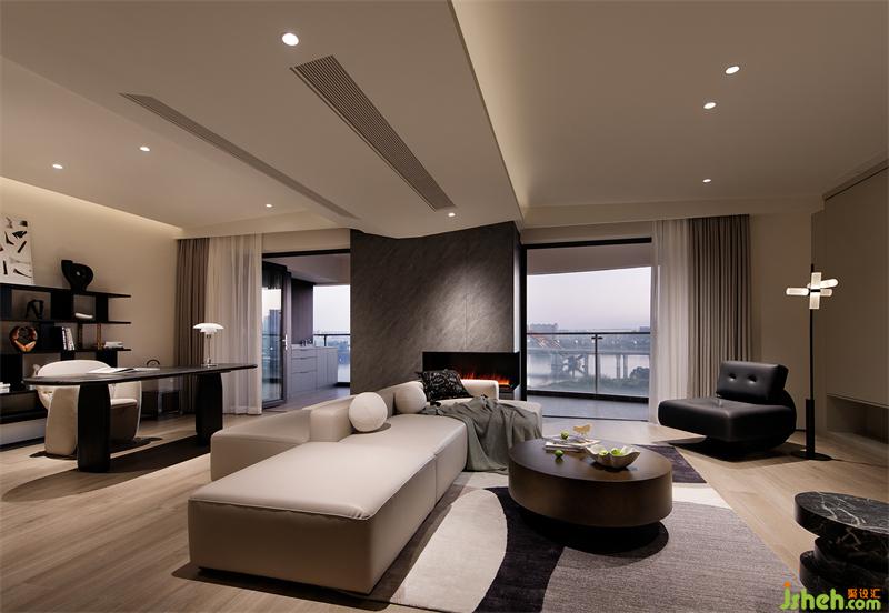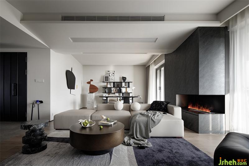 沉穩(wěn)厚重的煙熏色茶幾與高級灰絨面地毯結(jié)合,為整個客廳鋪墊一層溫馨的基調(diào)。
