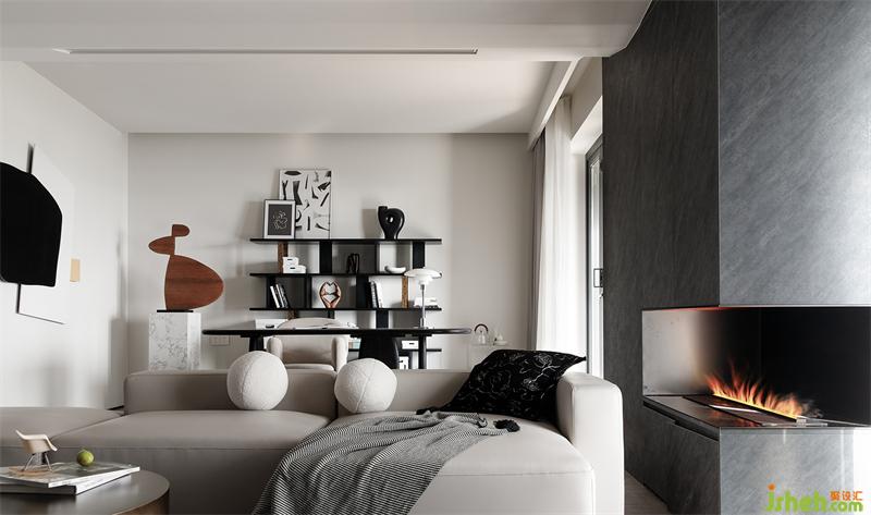 拆除書房墻體后,根據(jù)其位置靠墻打造了一個頂天立地的儲物柜,提供充足的儲物空間,柜門與同色系的背景墻融為一體,整體性更強,空間更顯整潔利落。儲物柜與沙發(fā)扶手等高處留空,嵌入電子壁爐,為家?guī)頊剀芭狻?