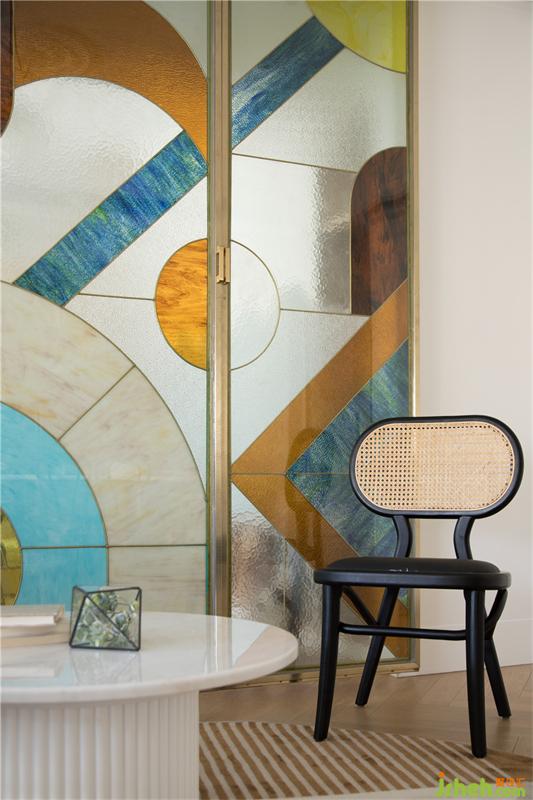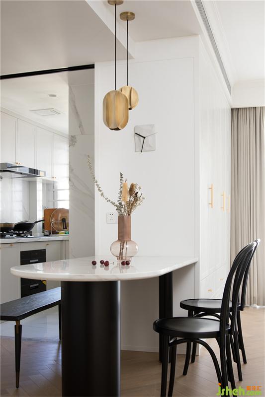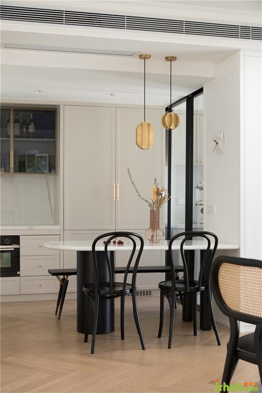 透過(guò)屏風(fēng)看餐廳,西廚臺(tái)面旁邊是兩扇隱藏式冰箱門,這樣讓空間更加整體風(fēng)格更加統(tǒng)一和諧。