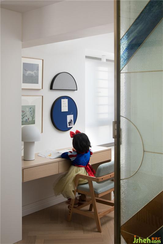 衣柜上半圓形的色塊,淺淺的藍(lán)色是小朋友柔柔的美夢(mèng),也呼應(yīng)著海浪的主題,下面特意空出來(lái)的玩具整理盒,更有利于小朋友養(yǎng)成自己收拾玩具的良好習(xí)慣。