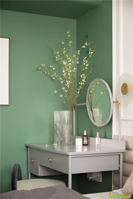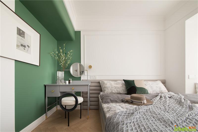 主臥通過簡單的綠色局部粉刷以及線條框和軟包的組合,讓原本局促的主臥,也顯得特別的有格調(diào)。
