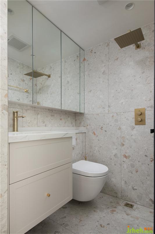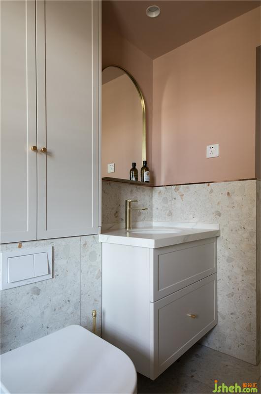 公衛(wèi)的水磨石和臟粉的結(jié)合,空間視覺上立馬就變得溫馨起來,馬桶的上面設(shè)計了收納柜隱藏在鏡子后面,這樣整個空間實際使用都會更加干凈整潔。