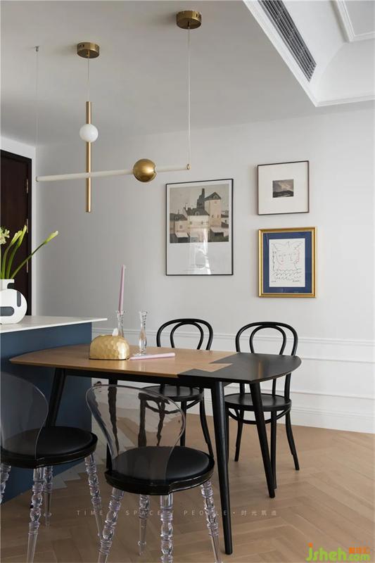 燕尾式拼接的餐桌和黑色的14號(hào)椅特別搭配,我們特意配了一張透明亞克力椅背的餐椅,減少椅子的存在感,增加空間的尺度感。