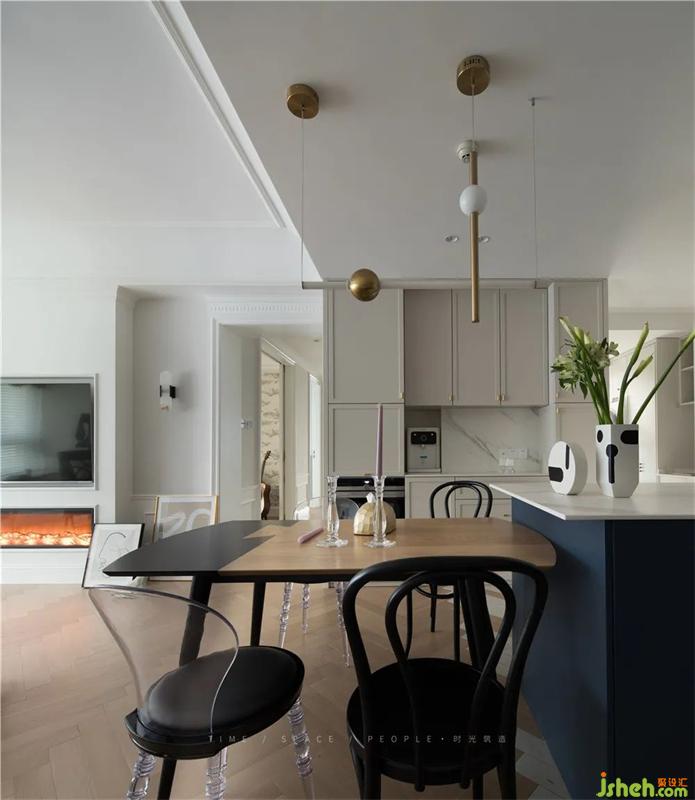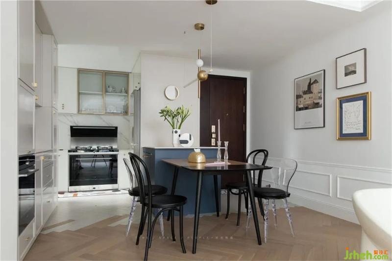 餐廳的全貌,可以看到地面的磚木交錯(cuò)鋪貼讓餐廳和廚房空間相互區(qū)分又相互融合,居中式餐桌排布,法式家居設(shè)計(jì)讓空間流線達(dá)到最有效使用。唯一就是應(yīng)該把入戶門顏色也協(xié)調(diào)下就更完美了。