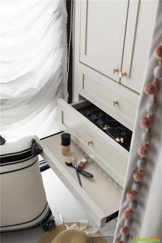 考慮到主臥的空間尺度,但又不想讓床頭柜都是儲物型,保持該有的顏值,機關(guān)收納三騰空而出,法式家居設(shè)計借用窗臺的空間做了一個立體式化妝收納柜。巧妙的隱藏在美美的窗簾后面,你如果以為只是這些那就錯了,上面柜門放置囤貨的面膜,化妝品等等柜門上貼有鏡子,第一層抽屜是首飾收納,也可以通過拉開托板成為一個簡易的化妝臺哦。(注意看拉手哦)