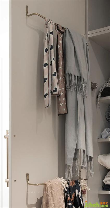 機關(guān)收納五,衣柜疊放的層板退進去15公分,疊衣服更方便,柜門側(cè)面還可以安裝掛桿用來陳列你美美的圍巾和皮帶。