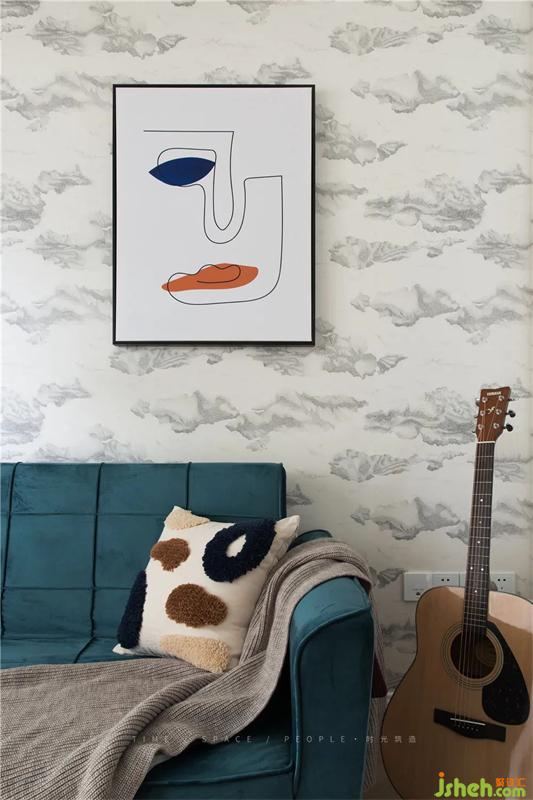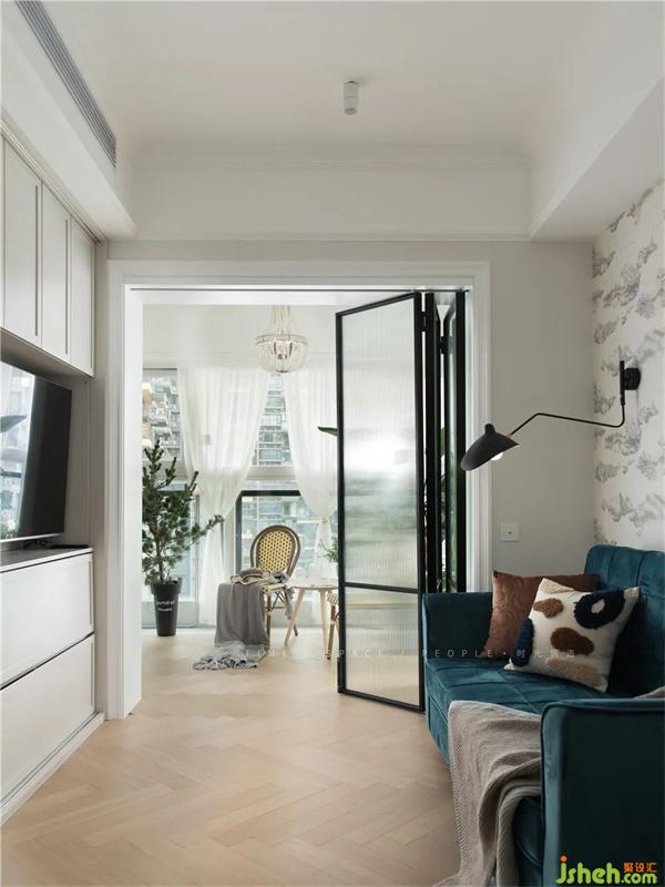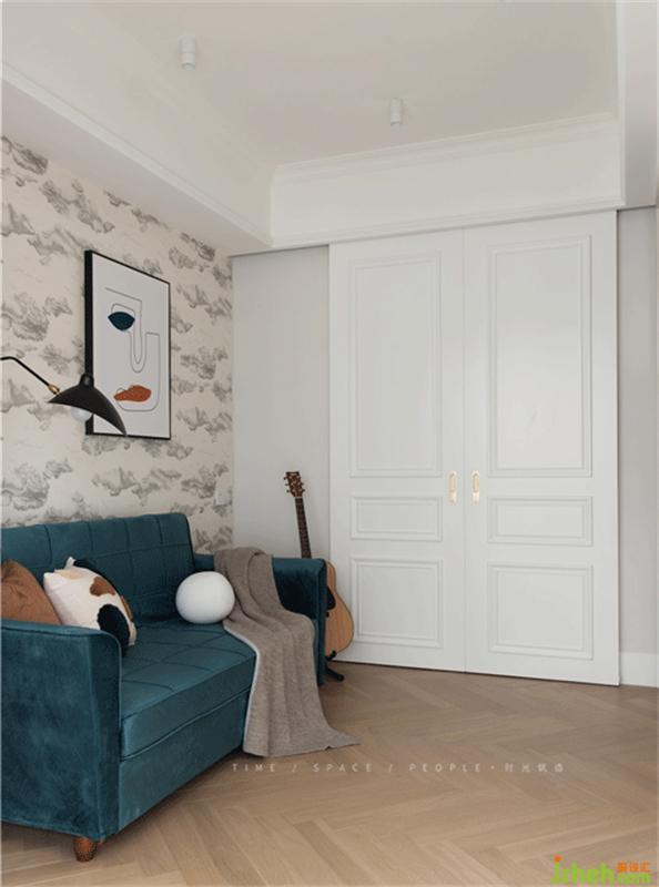 書房臨近過道的門是兩扇推拉的造型門,因為兩邊是墻,所以希望打開的時候門也是一個裝飾,和墻面的墻紙,沙發(fā)能形成一個場景感。