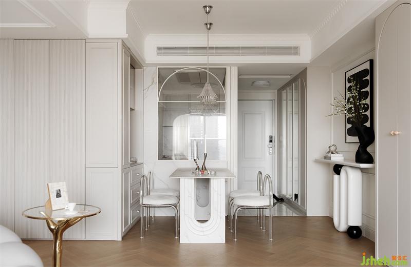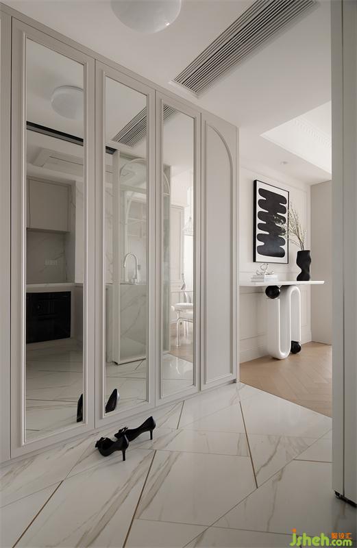 入戶的左手邊采用了大面積的鏡子設(shè)計(jì),法式藝術(shù)設(shè)計(jì)簡(jiǎn)約的拱形裝飾線條將鏡子包圍于其中,即可以起到作為穿衣鏡的作用又可以讓空間光感更加通透,而鏡子的后面又是具有強(qiáng)大收納功能的鞋柜,地面特意做了不規(guī)則的拼接切割處理,并且鑲嵌了銅條,入戶便更具儀式感和細(xì)節(jié)。
