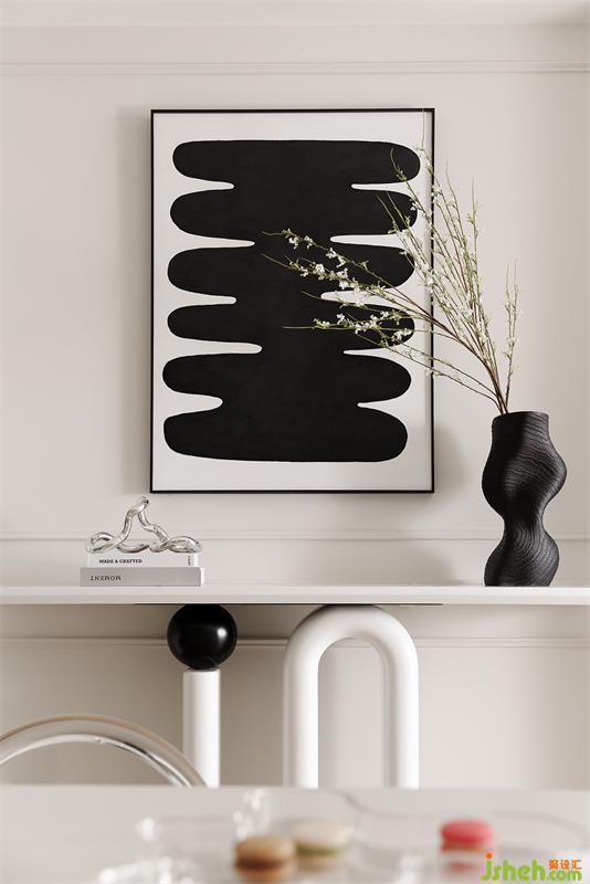 入戶的玄關(guān)臺(tái)特意與其他的部分做了凹凸的對(duì)比,即使是在靜止的空間內(nèi)我們也希望盡量呈現(xiàn)出動(dòng)態(tài)的視覺感受,法式藝術(shù)設(shè)計(jì)讓空間更立體也更有趣。一張藝術(shù)的玄關(guān)臺(tái),一幅抽象的黑白掛畫,一個(gè)憨態(tài)可掬的花瓶,簡(jiǎn)約的色彩點(diǎn)綴出入戶的特別之處。