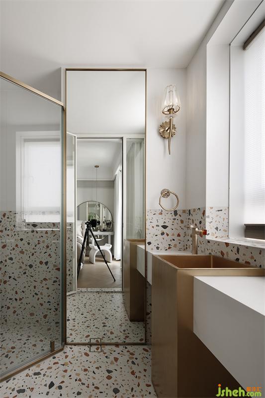主衛(wèi)的設(shè)計(jì)在客廳的材質(zhì)選擇上進(jìn)行了延用,法式藝術(shù)設(shè)計(jì)不銹鋼洗手盆與法式的水晶壁燈一同呼應(yīng),彩色的水磨石瓷磚將空間變得生動(dòng)了起來(lái)。