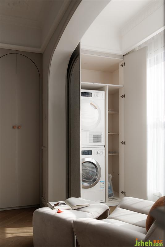 衣柜上的功能和入戶類似,特意安排在房門后面和床尾過(guò)道相對(duì),鏡子的大面積使用既能擴(kuò)展空間,又能有足夠的距離作為更衣鏡使用。