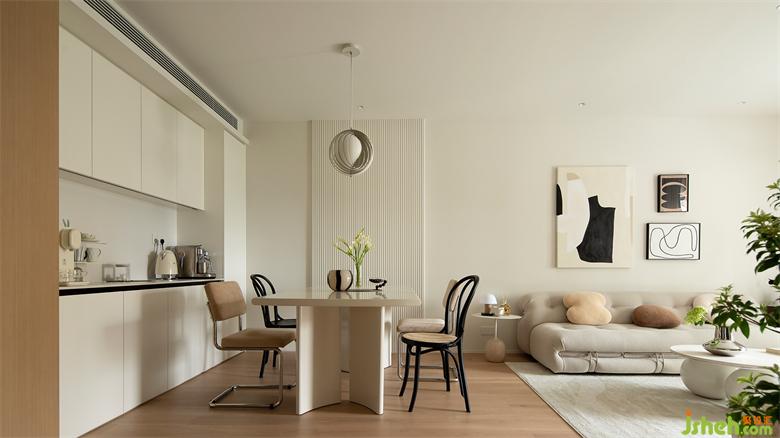 波浪板向上延伸,家裝設(shè)計(jì)吸引視線上移拉伸層高,輔以吊燈點(diǎn)綴,餐區(qū)作為走廊端景,美得像一副藝術(shù)畫(huà)作。
