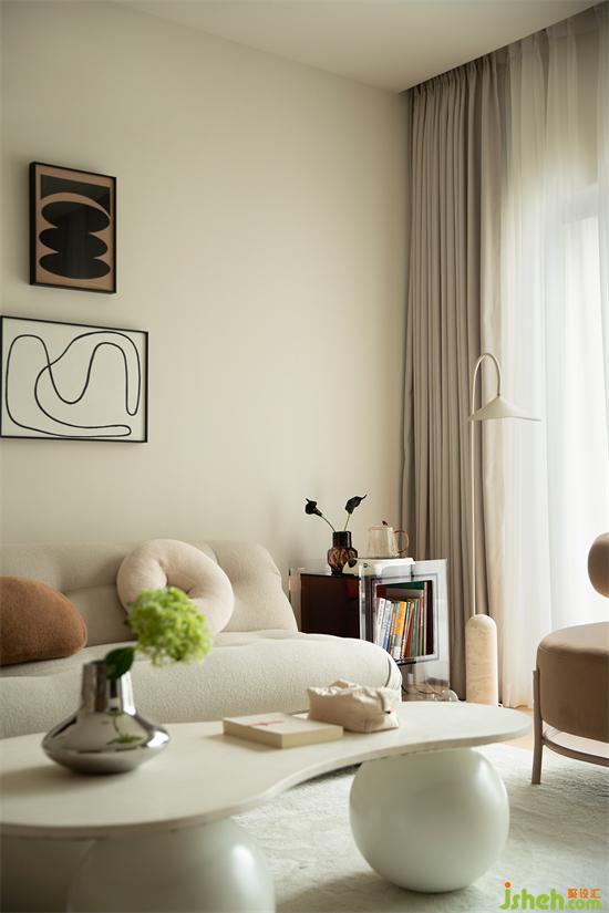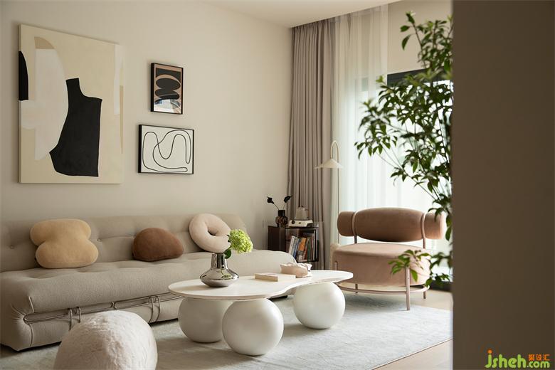 沙發(fā)、抱枕、地毯均為絨布質(zhì)感,親膚柔軟,符合整屋調(diào)性,家裝設(shè)計(jì)把家的溫馨舒適感展現(xiàn)淋漓盡致,這是奶油風(fēng)的基調(diào),也是家的真諦。