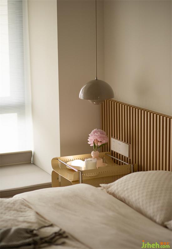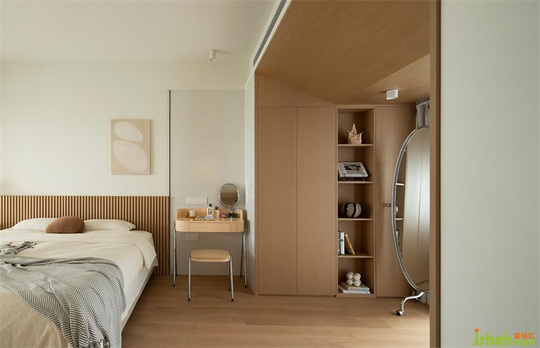 延續(xù)公區(qū)奶油色調(diào),原木的暖黃感一直貫穿其中,去床頭設(shè)計(jì)簡(jiǎn)潔大氣,半墻長(zhǎng)城板圈出床頭區(qū)域,家裝設(shè)計(jì)擯棄繁雜設(shè)計(jì),卻能夠依舊保持豐富質(zhì)感。