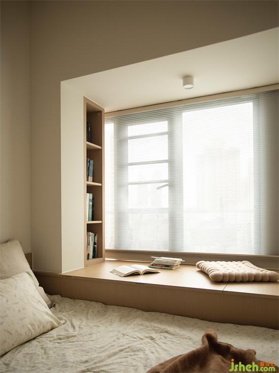 飄窗下方是收納空間,也是舒適閱讀角,墻壁打造原木開放格,小型書柜,實用美觀。