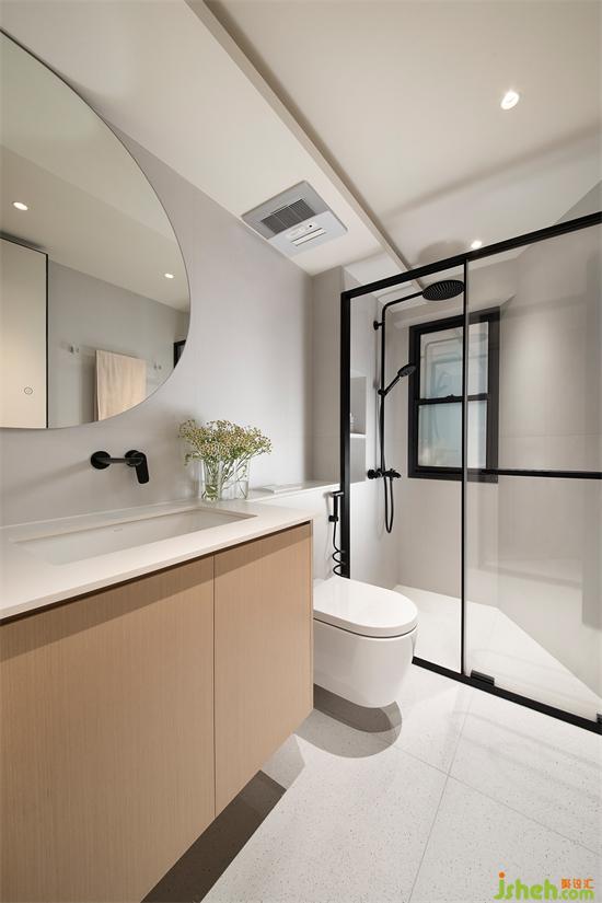 內(nèi)衛(wèi)采用灰白瓷磚通鋪,整潔統(tǒng)一,淋浴房采用下沉式設計,半框玻璃隔斷,視覺清爽無比。鏡柜一直延伸至馬桶區(qū)域,家裝設計拉伸空間的同時,加強收納能力。