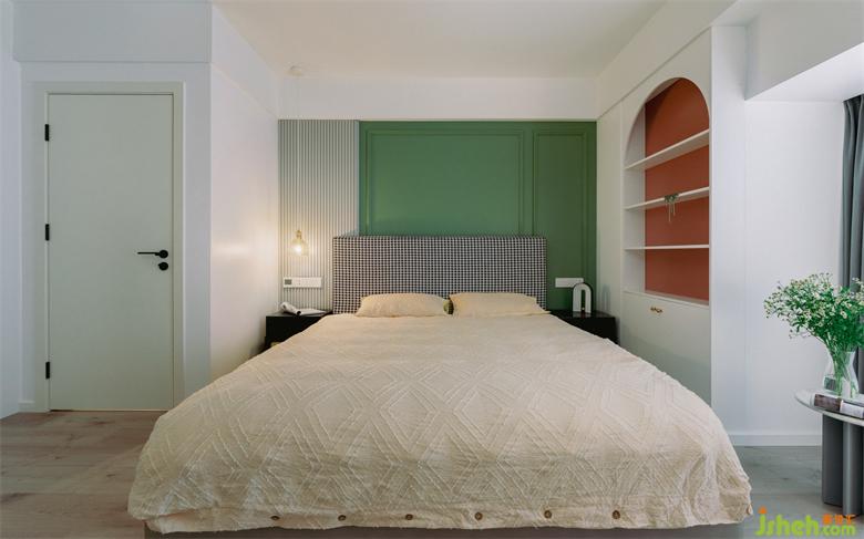 床頭的背景墻面用PU線條與長(zhǎng)城板做了造型分割,使整體更富有立體感,床頭一側(cè)打造整墻的收納柜,拱形壁龕與封閉柜結(jié)合,兼具收納及展示效果,家裝設(shè)計(jì)使空間視覺更加豐富。