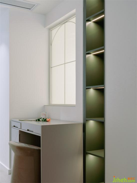 靠窗的位置定制一張梳妝臺用以豐富空間功能,讓屋主洗漱完后,就可以在這里完成梳妝、換衣的全部流程,有效縮短動線、提高生活效率。