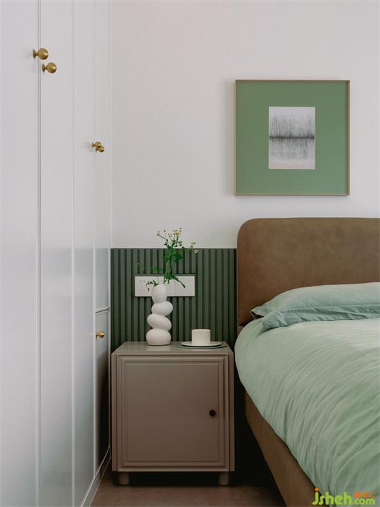次臥延續(xù)了綠色的主色調(diào),素雅純凈又不會讓空間過于寡淡,為臥室增添些許愜意和生機(jī),家裝設(shè)計營造出自然寧靜的睡眠氛圍。