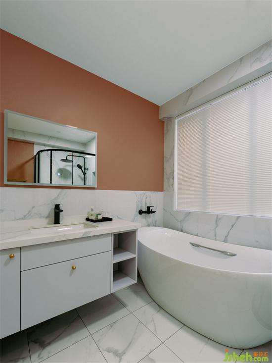 區(qū)別于滿墻瓷磚的衛(wèi)生間,主衛(wèi)用半墻橙色防水漆與半墻瓷磚結(jié)合,增加衛(wèi)生間墻面層次感,搭配白色系衛(wèi)浴產(chǎn)品與大理石瓷磚,家裝設(shè)計使空間呈現(xiàn)出簡潔明快的感覺。