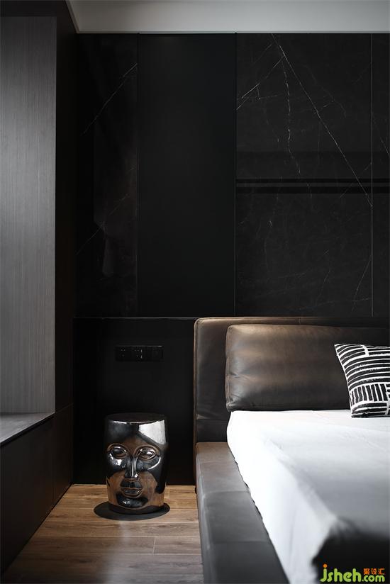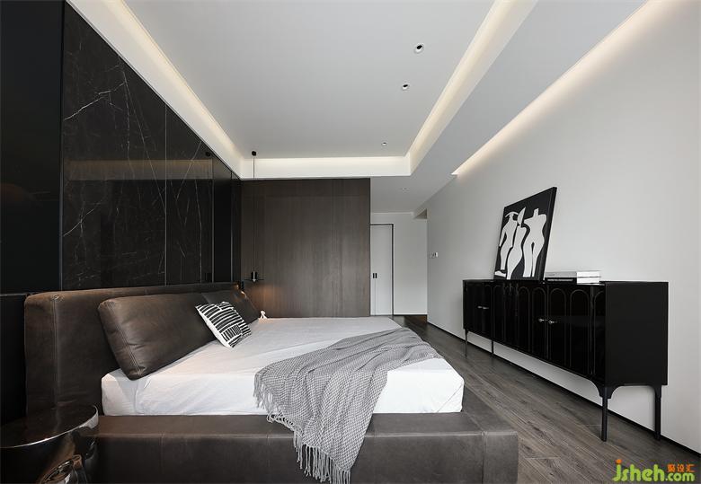 呼應(yīng)整體風(fēng)格,地板也選用灰黑色,與木飾面保持統(tǒng)一。家裝設(shè)計(jì)床尾放置斗柜,柜門是黑色鏡面質(zhì)感,不同材質(zhì)豐富空間層次,黑白色調(diào)裝飾畫矗立在上,彰顯時(shí)尚氣息。