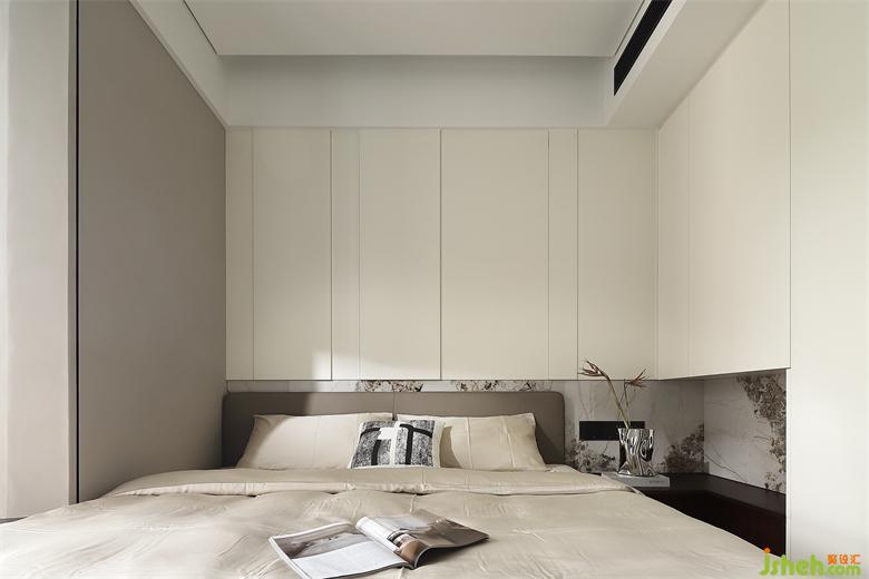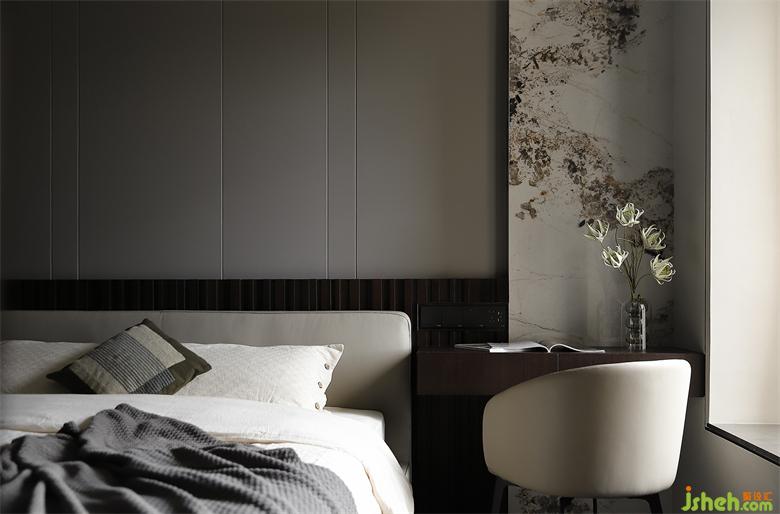 淺灰硬包搭配半墻格柵板,側(cè)邊以秀美巖板裝飾,共創(chuàng)內(nèi)斂高級(jí)感床頭空間。窗邊角落打造懸空臺(tái)面,床頭梳妝一角順應(yīng)而生,美觀便捷。