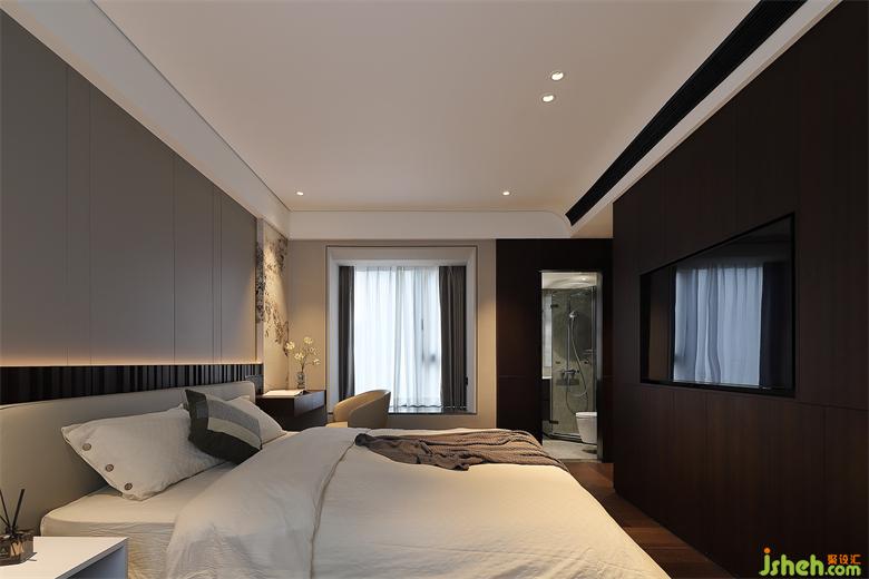 吊頂轉(zhuǎn)角以弧面尺度過渡,柔和引出空調(diào)出風(fēng)口,順延而下墻面用木飾面包裹,豐富臥室質(zhì)感的同時(shí),家裝設(shè)計(jì)將液晶電視隱藏其中,與墻面保持齊平,空間整潔大氣。