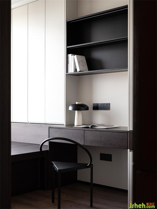 從衣柜中延伸出床頭柜區(qū)域,家裝設(shè)計(jì)還能充當(dāng)小書桌與梳妝臺(tái)使用,小空間實(shí)現(xiàn)大功能,層層開放格搭配燈帶,書柜功能區(qū)也是臥室氛圍感來源。