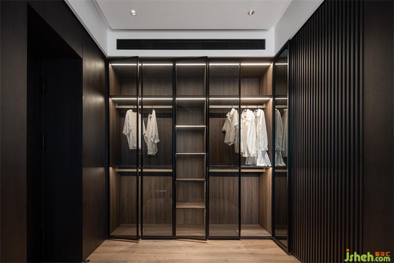 部分衣柜采用玻璃柜門,放置一些常穿衣物一目了然,內(nèi)嵌燈帶氛圍滿滿,作為展示區(qū)也是不錯(cuò)的選擇,家裝設(shè)計(jì)增強(qiáng)衣帽間的功能性與靈動(dòng)感。