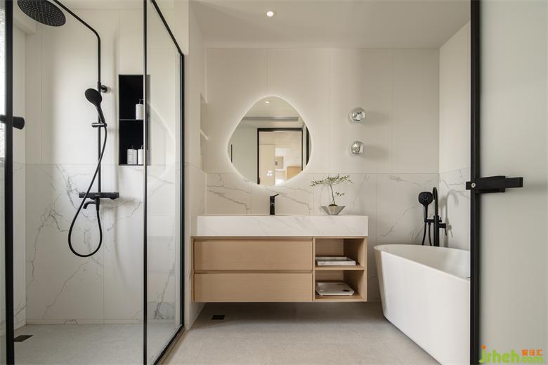 衛(wèi)生間用了三種磚,地面是水磨石瓷磚,墻面下部分采用仿大理石磚,上半部分則是奶白色柔光磚,整體色調(diào)統(tǒng)一,空間清新淡雅、層次豐富。家裝設(shè)計(jì)原木浴室柜點(diǎn)綴其中,搭配巖板一體式臺(tái)盆,呼應(yīng)全屋調(diào)性。