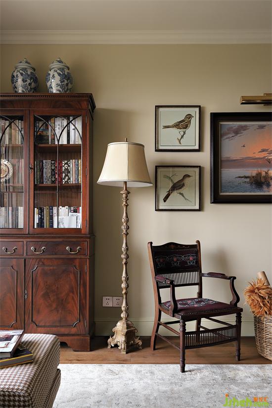 客廳另一邊擺放中古書柜,與餐邊柜質(zhì)感一致,落地?zé)?、臺燈以及壁燈不僅是夜間氛圍燈光,更是重要的軟裝物件,功能與顏值實(shí)現(xiàn)統(tǒng)一,對于眾多的燈具,也要提前預(yù)留好插座,做好充分的應(yīng)援。