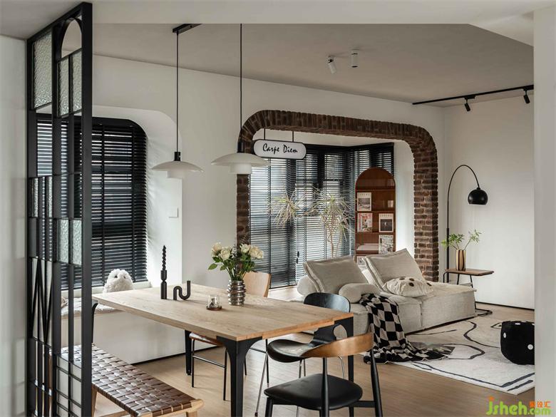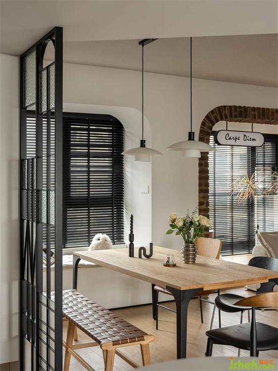 客餐區(qū)窗戶均為黑色鋁百葉,與鐵藝屏風(fēng)形成對照,強(qiáng)調(diào)北歐風(fēng)的工業(yè)感,餐桌椅也多以黑色作為點(diǎn)綴,統(tǒng)一空間色調(diào),深圳南山東關(guān)樂尚林居家裝設(shè)計(jì)營造和諧大氣的風(fēng)格氛圍。