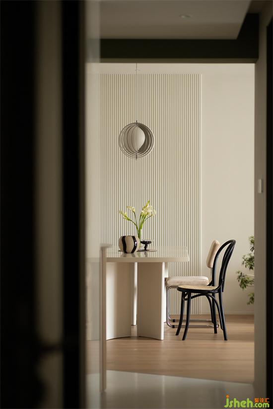 墻面用波浪板強(qiáng)調(diào)餐廳區(qū)域,球狀吊燈精致獨(dú)特,深圳福田香格麗苑家裝設(shè)計搭配寬敞餐桌,圈出舒適的就餐氛圍。