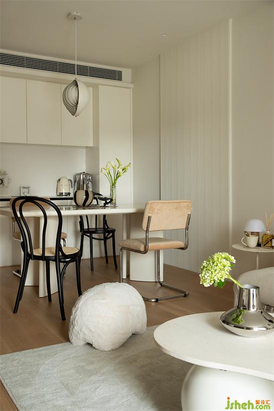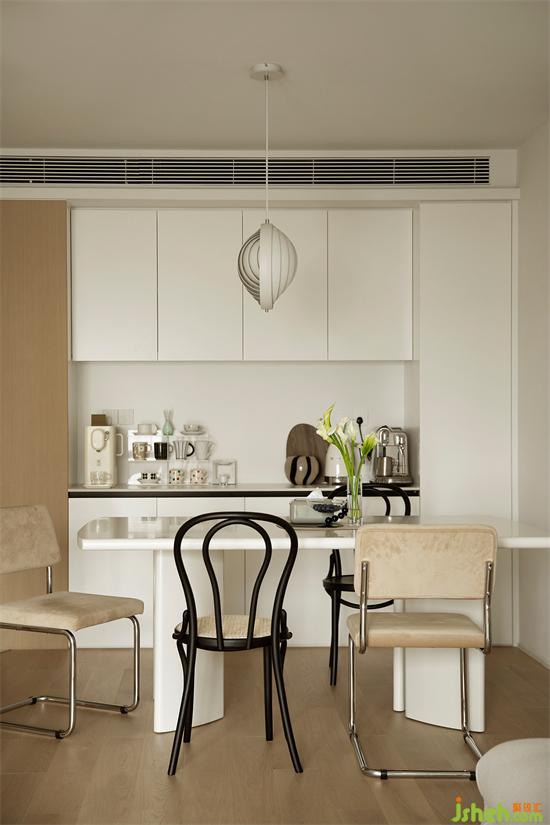 利用吊頂結(jié)構(gòu)推出純白餐邊柜,整體美觀統(tǒng)一,臺面擺放精美杯具與小家電,展現(xiàn)屋主的高品質(zhì)生活。