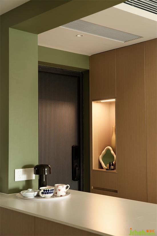 玄關(guān)柜儲物空間豐富,抽屜、鞋柜、衣柜滿足不同的收納需求,開放格緊挨入戶大門,深圳福田香格麗苑家裝設(shè)計擺放香薰以及裝飾鏡,方便出門時整理儀表。