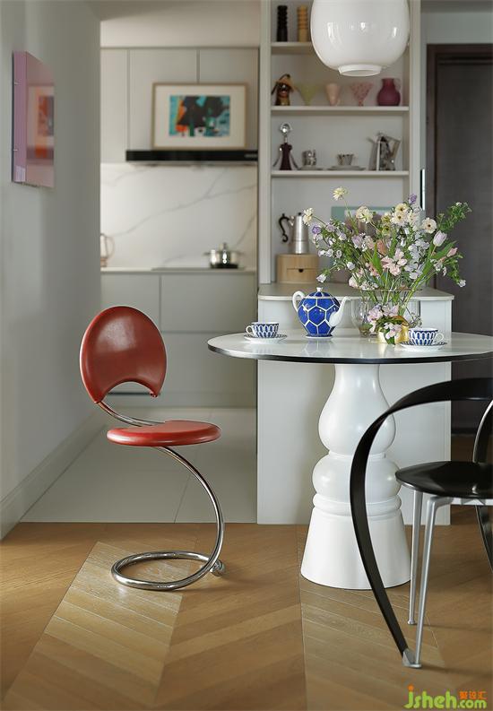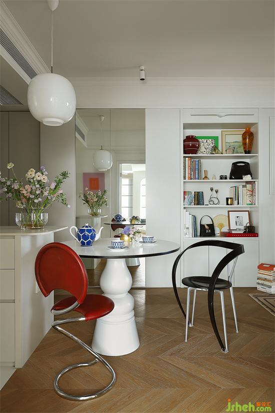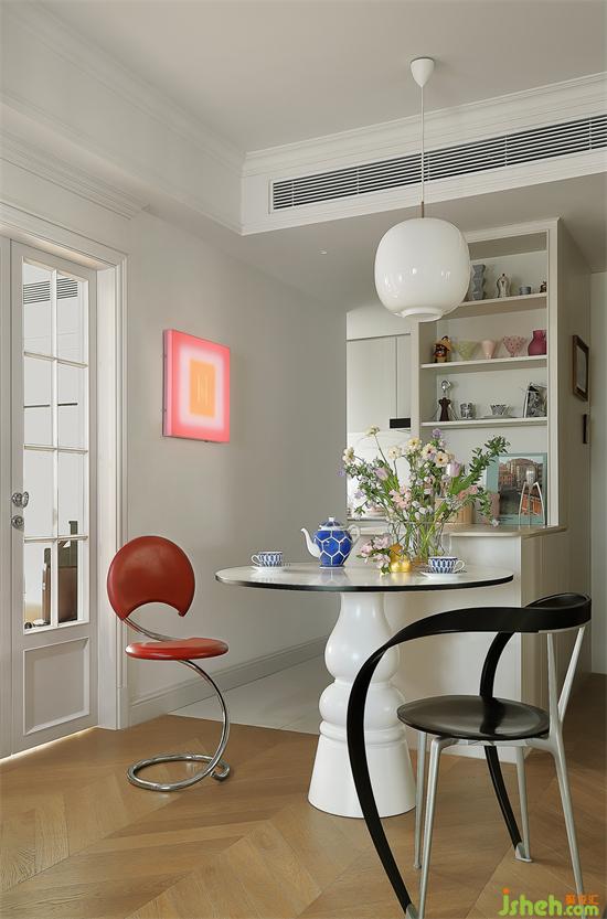 空間白色為主、小面積彩色為輔的配色比例,在碰撞張力中鋪墊了高雅基調(diào),更能襯托出每一處設(shè)計的巧思。