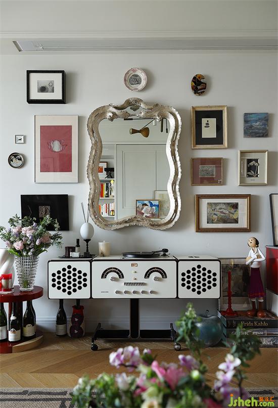 意大利進(jìn)口Brionvega笑臉音箱,訂購八個月,漂洋過海來到家中,有自己獨立品牌的業(yè)主,十分尊重原創(chuàng)設(shè)計,家里的每一件物件都耐人品味。墻面以裝飾鏡為主,四周擴(kuò)散著精美掛畫以及墻飾,亂中有序,法式公寓風(fēng)格展現(xiàn)藝術(shù)美之外,恰如其分的游走著生機與活力。
