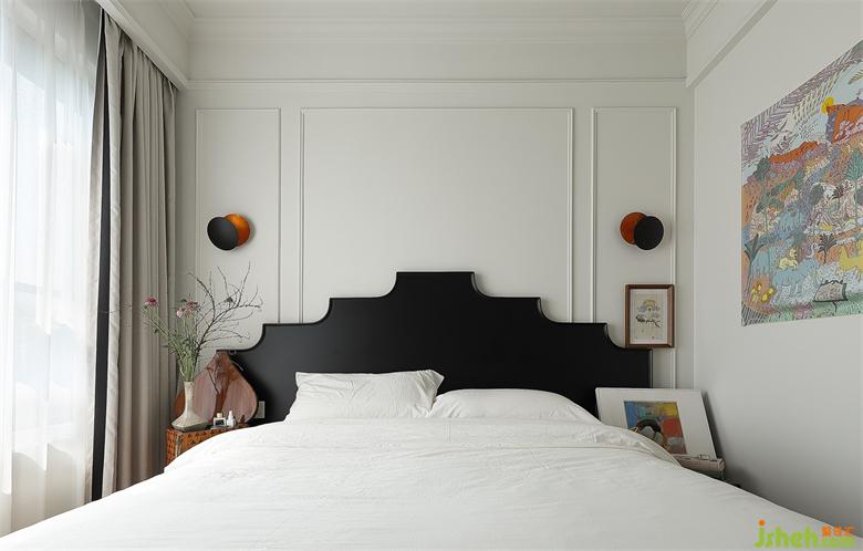 背景墻采用石膏線條簡單裝飾,重點來突出床頭的造型感,定制床頭盡顯業(yè)主高品質(zhì)審美。兩側(cè)搭配小巧壁燈,呼應(yīng)床頭顏色,大氣高級的復(fù)古調(diào)充分迸發(fā),黑與白的碰撞多了一份時尚的優(yōu)雅感。