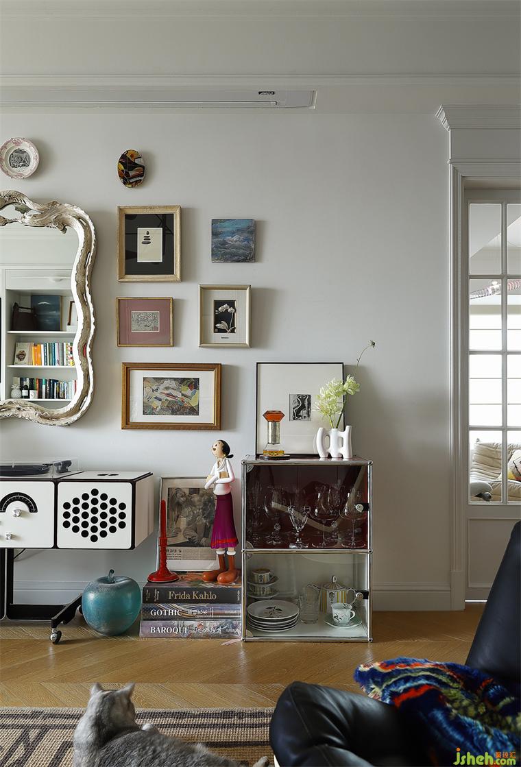 因?yàn)闃I(yè)主自己也是做設(shè)計(jì)相關(guān)的,選擇這種風(fēng)格是因?yàn)樗嗄暝诜▏沁吜魧W(xué)的一個經(jīng)驗(yàn),然后她經(jīng)常住的是法國老公寓,當(dāng)然也希望自己的家也是法國老公寓的這種風(fēng)格;這種風(fēng)格最大特點(diǎn)就是會有法式的基礎(chǔ),通過業(yè)主的職業(yè)特征或者生活習(xí)慣,會添加自己很多的喜好在里面,因?yàn)榉孔硬皇呛艽?,業(yè)主有很多的收藏,最后呈現(xiàn)出來就比較滿一點(diǎn)。