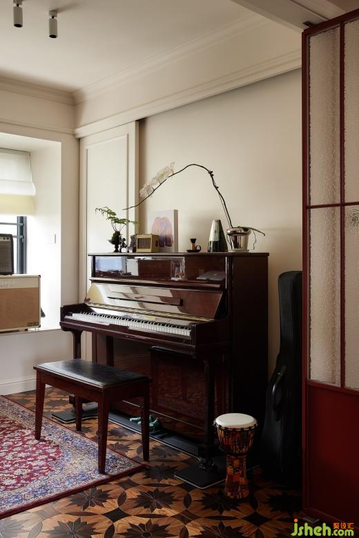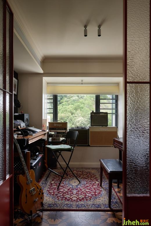 透過(guò)復(fù)古玻璃門(mén),可以看到里面若隱若現(xiàn)的景色,仿佛這個(gè)音樂(lè)房是一個(gè)獨(dú)立的音樂(lè)世界,卻又與外界有著若有若無(wú)的聯(lián)系。