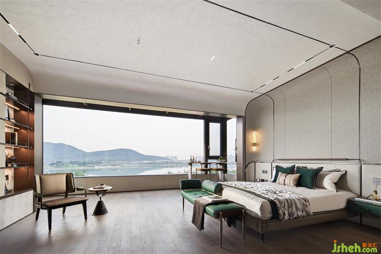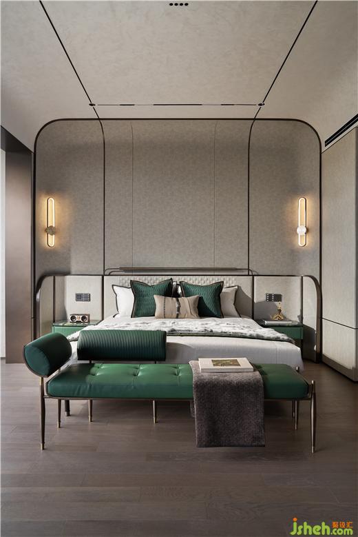 艾未設計以瓦松綠與弧形手法打造寧靜質感的空間墻面,灰度適中,給臥室最放松的環(huán)境。