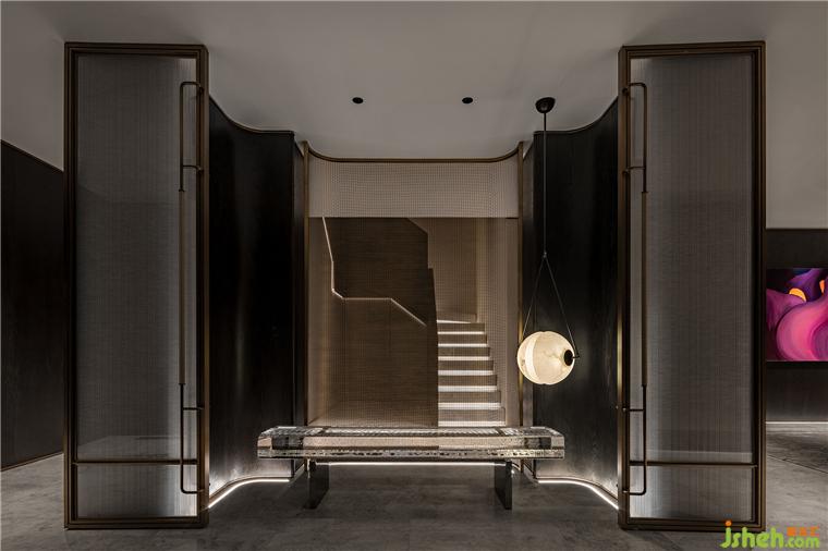 玄關(guān)似一座水晶宮殿,以四面通高的玻璃門,將內(nèi)、外朦朧劃分,渲染秘境之感。每組門的開合轉(zhuǎn)換,可實現(xiàn)不同功能區(qū)的劃分。北京半山別墅設(shè)計圍繞此而設(shè)的隱藏式儲物柜,旨在滿足居者不斷增長的收納需求。金屬網(wǎng)勾勒出旋轉(zhuǎn)而上的樓梯輪廓,令人心向往之。