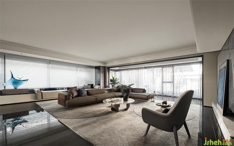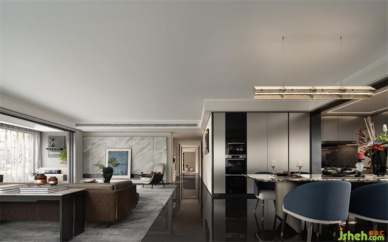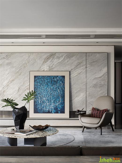 落地窗將繁華與景致盡收眼底,訴說著包容、開放的都市之美??蛷d更是家庭聚會的互動空間,暢通的洄游動線,勾勒大宅的非凡氣度。樣板房設(shè)計以灰調(diào)為基底,在溫潤的木飾面與花紋大理石、金屬等多種材質(zhì)肌理的巧妙碰撞中,極具視覺魅力。