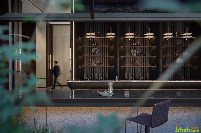 物以載道是中國傳統(tǒng)的思想與文化特征。艾未設(shè)計(jì)亦注重取其形,彰其意,以黑金石材的吧臺做底,令金屬架化身船槳,在弧形層架的背景之下,一支烏篷船仿佛即將隨風(fēng)啟航。