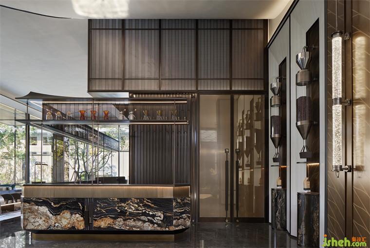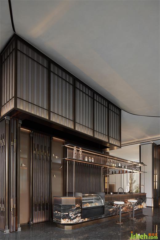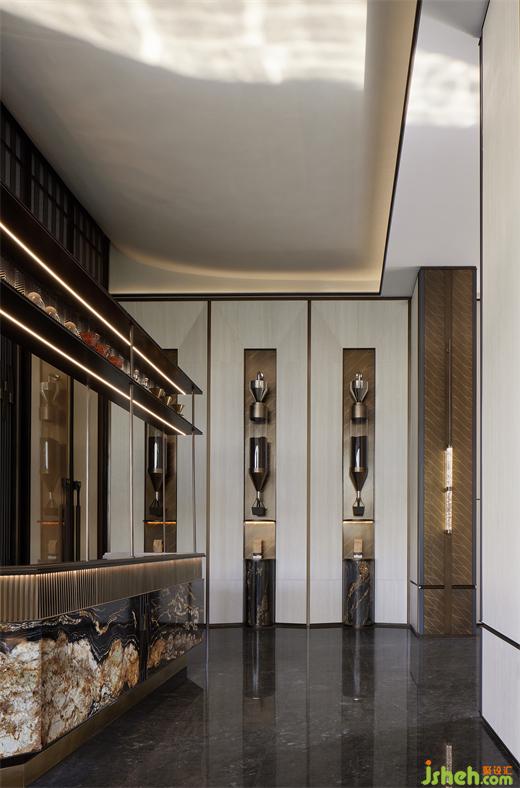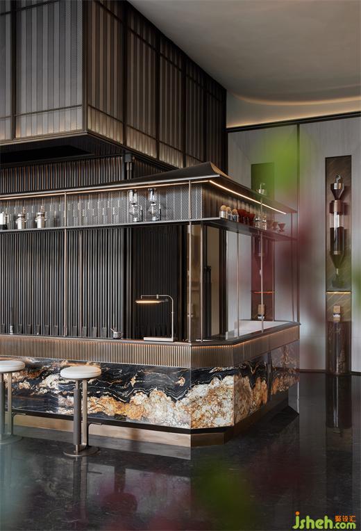 遵循中國古典的步入方式,在空間起承轉(zhuǎn)合之際,往往藏匿著一些不期而遇的驚喜。酒吧區(qū)置身于高聳的屏風(fēng)背后,吧臺呈層疊與托起的姿態(tài),優(yōu)雅的弧形與背景陣列的酒柜格架、韻律分明的吊燈交相輝映,既彰顯層次之美,又和諧一體。黑色的石材與金色的構(gòu)件搭配仿佛置身于蓋茨比時代的雞尾酒吧,展現(xiàn)出浪漫迷人之感。