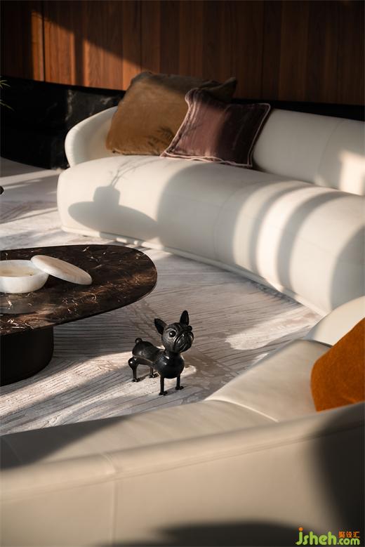 Daniel Daviau的鵜鶘雕塑棲于茶幾之上,而Jean-Marie Fiori的法國(guó)斗牛犬則隨性立于地面。藏品無(wú)言,以其獨(dú)特的風(fēng)情和生活化的存在,暗自透露著業(yè)主的藝術(shù)追求與卓越品味,又實(shí)現(xiàn)收藏、設(shè)計(jì)與歲月的相伴共生。