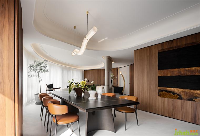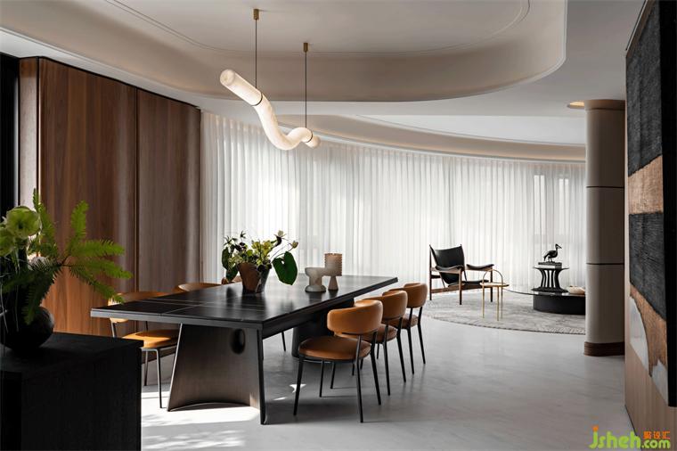 餐廳置有與翠湖入戶大堂同系列的云石吊燈,以一條流暢的曲線引導感知。在某種程度上,這既是從外部到歸家的過渡,又渲染著自由舒緩的狀態(tài)。這也是設計師世亮注重設計語匯的統(tǒng)一和延續(xù)的又一印證。